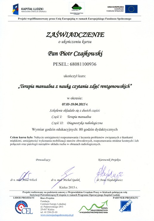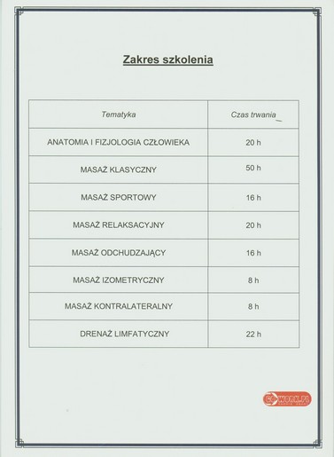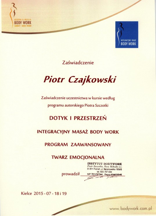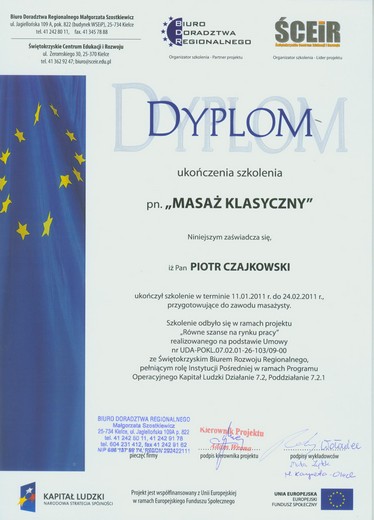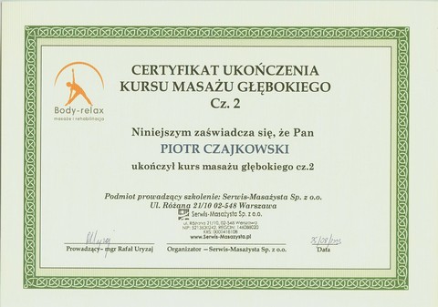 - Absolwent kursów i szkoleń masażu w Krakowie, Kielcach, Wrocławiu, Piszu, Poznaniu i Warszawie (niżej więcej informacji)